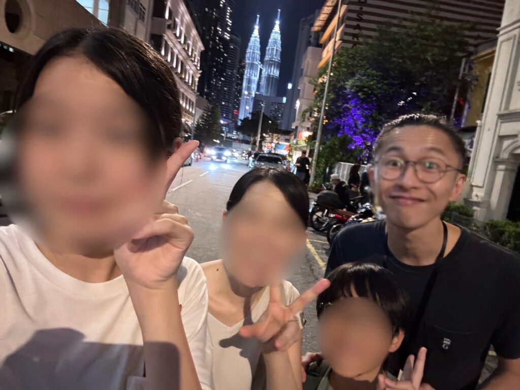 ツインタワーがバックにいい感じに入って良い感じに映えます。ということもあってかこの辺のエリアは写真撮ってる人が多かった。あまりオサレなエリアに来ることがないので我々も便乗して家族フォト。